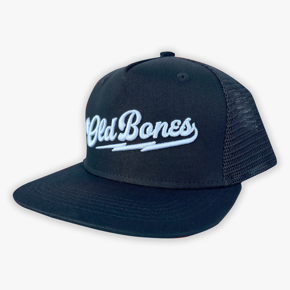 An Old Bones trucker hat designed with comfort in mind, the Old Bones Team Bolt hat has mesh panels in the back for maximum breathability. Raised white embroidery on the front panel.